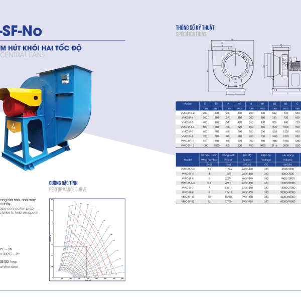 - Quạt ly tâm hút khói hai tốc độ VCM-SF-No được thiết kế đặc biệt có khả năng hoạt động với 2 tốc độ: